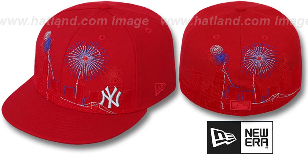'Authentic' and ORIGINAL 59FIFTY fitted hat by New Era, red wool deep crown and and visor, raised embroidered 'Flawless' team logo on front side in metallic silver and black, New Era Exclusive 'CITY SKYLINE' embroidery around bottom of front two and back two panels in black with red, white and blue outline, matching embroidered Fireworks above city skyline, MLB logo on rear of hat in red
