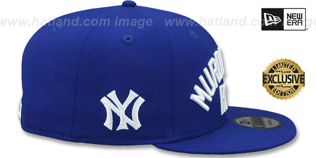ORIGINAL fit 9FIFTY adjustable hat by New Era that has similar deep crown and flat brim fit as the 59-Fifty, royal blue authentic poly crown and visor with light grey undervisor, raised embroidered MURDERERS' ROW on front, embroidered Cooperstown team logo on side, white plastic adjustable Snapback strap. Murderers’ Row were the baseball teams of the New York Yankees in the late 1920s, widely considered one of the best teams in history. The nickname is in particular describing the first six hitters in the 1927 team lineup: Earle Combs, Mark Koenig, Babe Ruth, Lou Gehrig, Bob Meusel, and Tony Lazzeri. This hat produced EXCLUSIVELY for HATLAND.COM