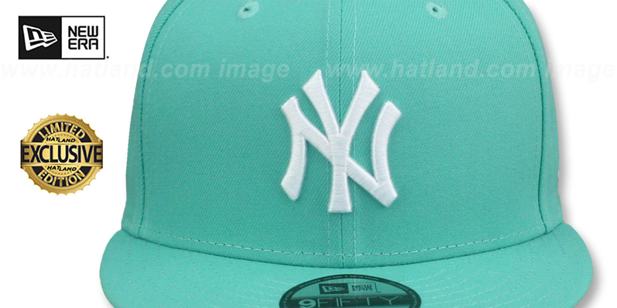 Original 9FIFTY adjustable poly hat by New Era that has similar deep crown and flat brim fit as the 59-Fifty, clear mint crown and visor, light grey undervisor, raised embroidered team logo on front in white, embroidered New Era logo on side in white, white adjustable Snapback closure