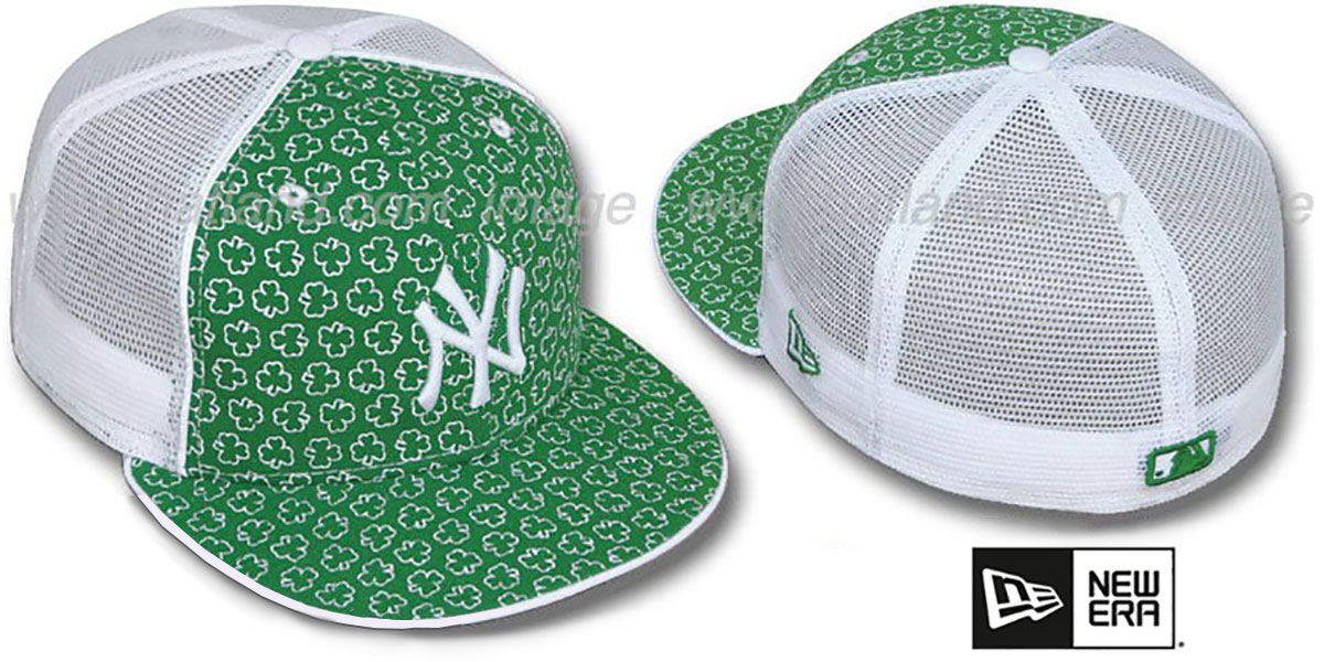 Authentic New Era ORIGINAL 59FIFTY fitted hat, kelly green cotton front panels and visor with New Era EXCLUSIVE St Patricks SHAMROCK Flocking print in white, white undervisor and flip, white trucker mesh mids and back panels with white piping between mid and front panels, raised embroidered team logo on front in white, matching MLB logo on back
