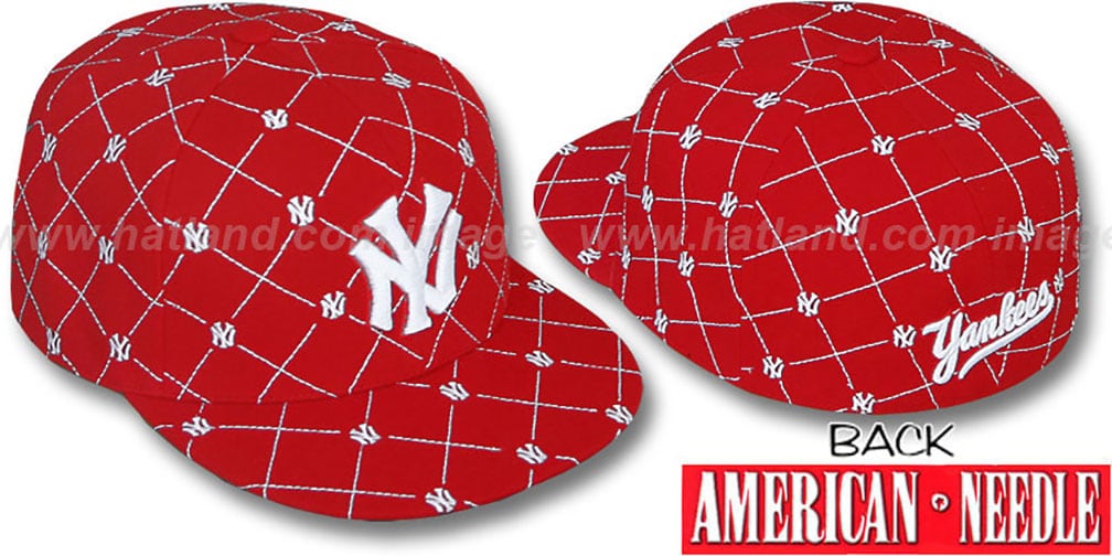 structured 6 panel fitted hat with deep crown with flat brim, red wool blend crown and visor with Daimond pattern stitching and small team logos All-Over crown and visor in white, raised Cooperstown, Old School team logo on front in white, matching secondary Cooperstown, Old School team logo on back